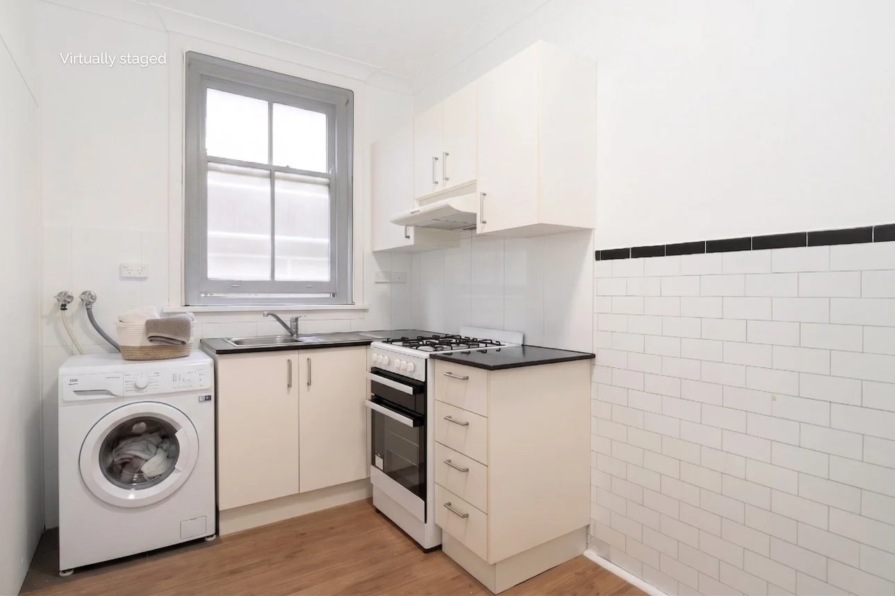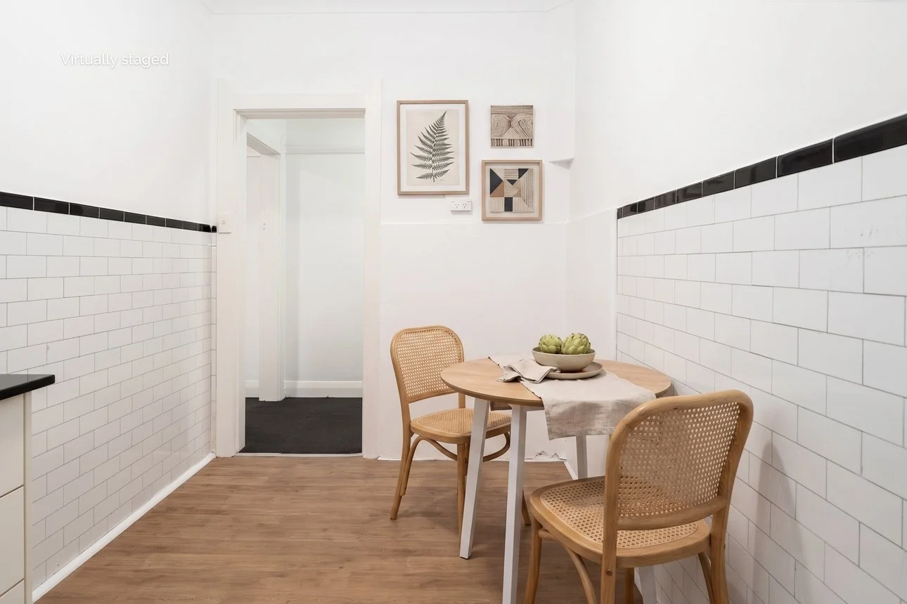 Prior to us shooting and staging the apartment the property was online with images that showed the property empty, by adding virtual furniture we not only showed all rooms in their best light, but even added a dining room image, shot inside the kitchen space - helping show potential tenants and buyers the kitchen space is actually very functional - this was a much needed photo on the online advertisment because until we were engaged the only shot of the kitchen was facing the cabinets - previously not showing how this roomy space next to the cabinets could be utilised.
